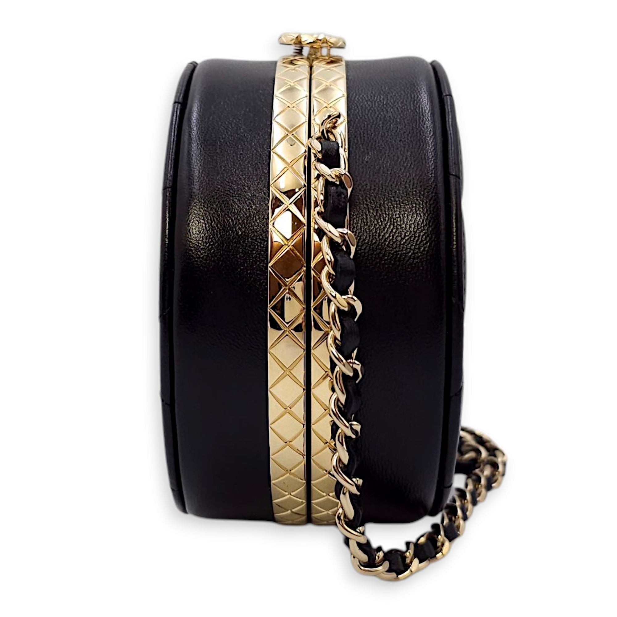 Quilted Filigree Chain Around Circle Black Crossbody Bag in Lambskin, Gold hardware